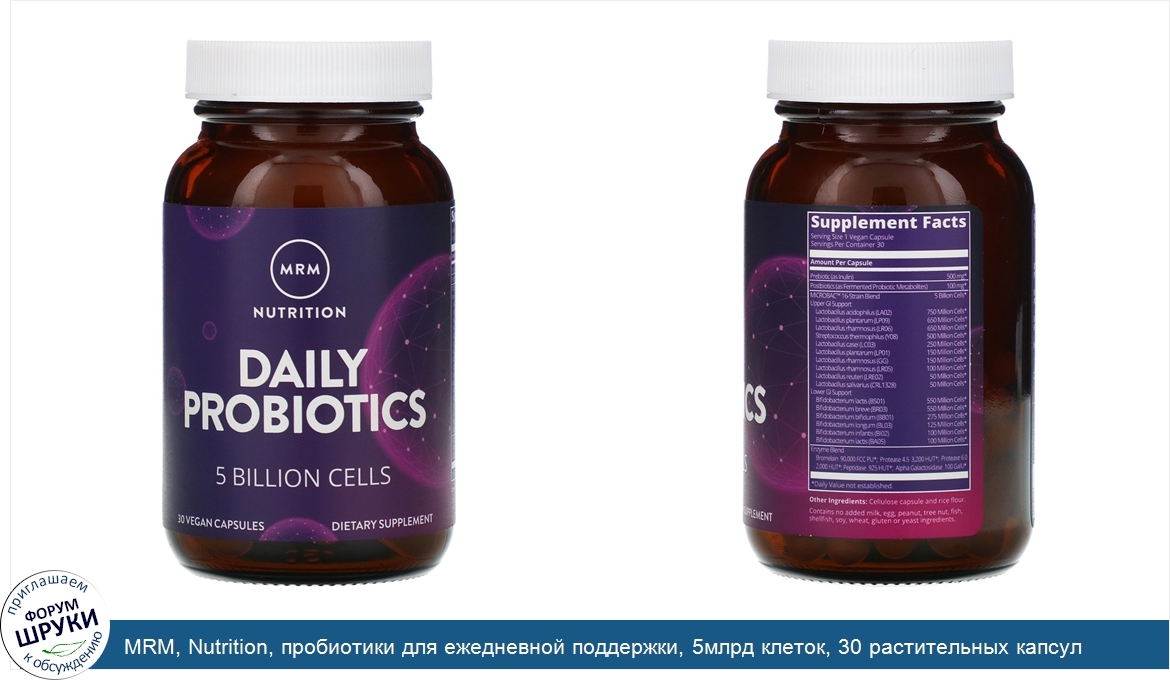 Друзья, если у вас есть отзыв/дополнение/комментарий/вопрос относительно MRM, Nutrition, пробиотики для ежедневной поддержки, 5млрд клеток, 30 растительных капсул - напишите его ответом в эту тему (это будет полезно всему сообществу в целом и вам в отдельности).