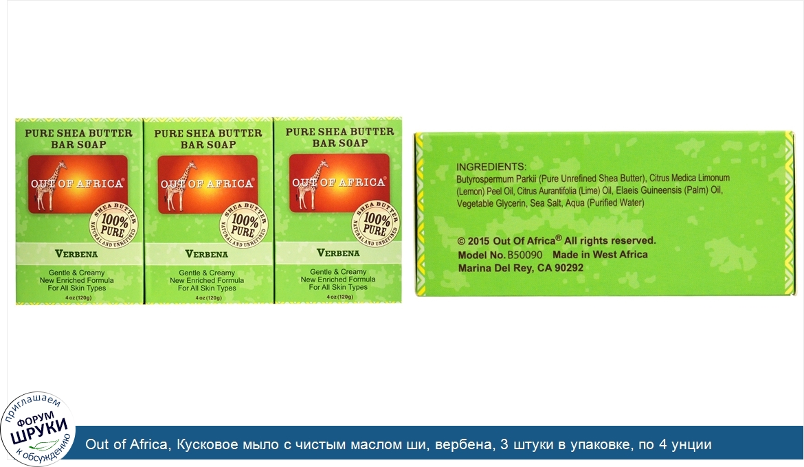 Друзья, если у вас есть отзыв/дополнение/комментарий/вопрос относительно Out of Africa, Кусковое мыло с чистым маслом ши, вербена, 3 штуки в упаковке, по 4 унции (120 г) каждое - напишите его ответом в эту тему (это будет полезно всему сообществу в целом и вам в отдельности).