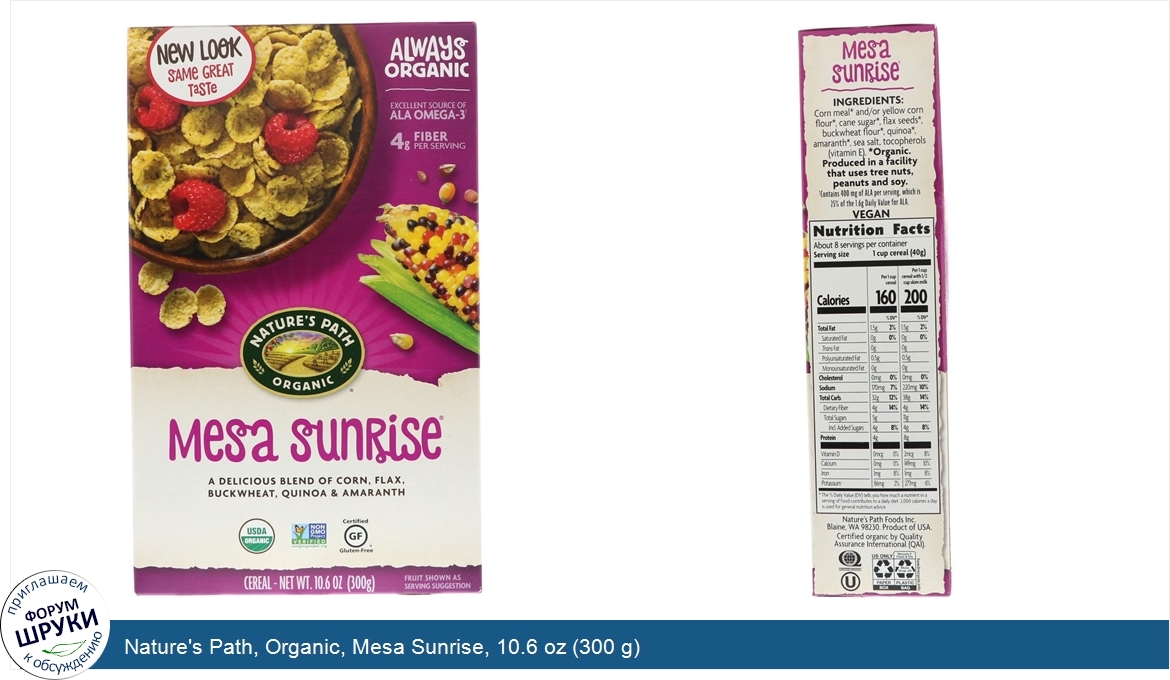 [DESCRIPT]Same Great Taste. Always Organic. Excellent Source of ALA Omega-3†. 4 g Fiber Per Serving. A Delicious Blend of Corn, Flax, Buckwheat, Quinoa Amaranth. USDA Organic. Non GMO Project Verified. Certified Gluten-Free. Cereal. Vegan. Certified Organic by Quality Assurance International (QAI). Our Mesa Sunrise cereal is a delicate blend of organic corn, quinoa, buckwheat, amaranth, and flax, for a super crunchy and delicious breakfast you can't help but love. And with such simple, wholesome ingredients- you'll see how good gluten free can be. "Our Always Organic Legacy began on the family farm I was raised on - well before the organic 'industry' began. In 1985, my wife Ratana and I founded Nature's Path Organic Foods based on my dad's advice to 'Always leave the soil better than you found it', by farming without chemical pesticides, fertilizers or GMOs. For over 30 years, our family has aspired to make delicious organic foods and an enduring independent company that you can love and trust". Arran - From our family to yours, Arran Stephens, Co-founder. †Contains 400 mg of ALA per serving, which is 25% of the 1.6 g Daily Value for ALA.[/DESCRIPT]... (описание дополняется)