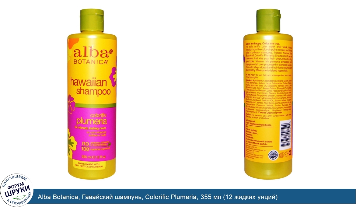 Друзья, если у вас есть отзыв/дополнение/комментарий/вопрос относительно Alba Botanica, Гавайский шампунь, Colorific Plumeria, 355 мл (12 жидких унций) - напишите его ответом в эту тему (это будет полезно всему сообществу в целом и вам в отдельности).
