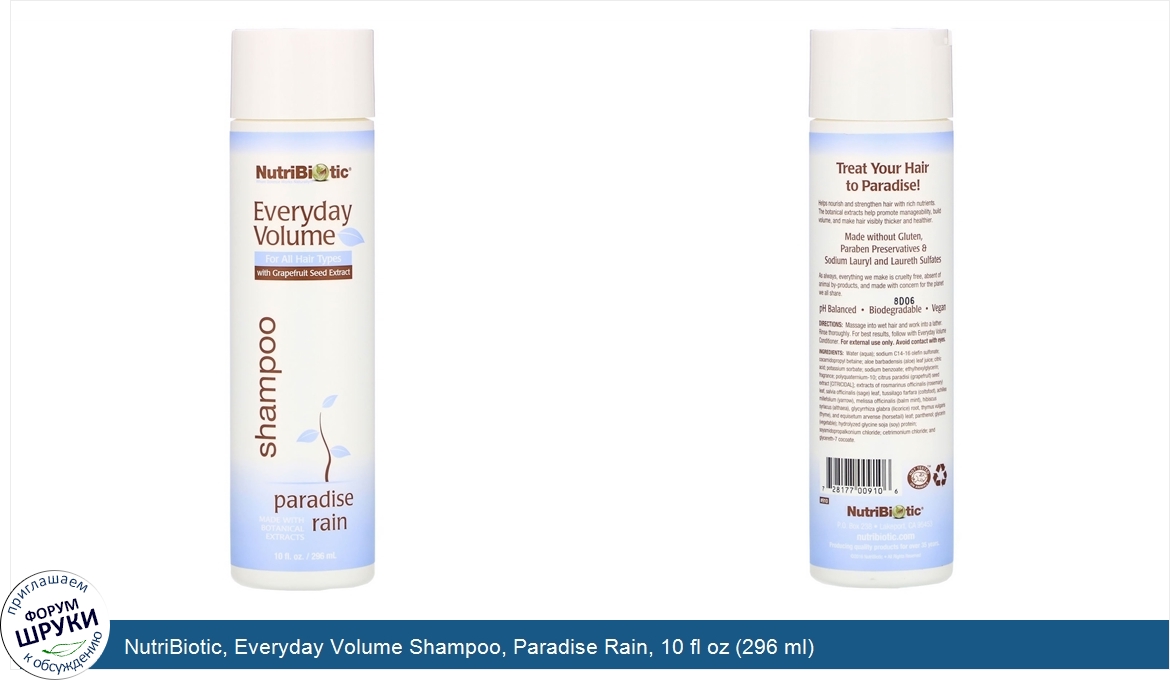 Друзья, если у вас есть отзыв/дополнение/комментарий/вопрос относительно NutriBiotic, Everyday Volume Shampoo, Paradise Rain, 10 fl oz (296 ml) - напишите его ответом в эту тему (это будет полезно всему сообществу в целом и вам в отдельности).