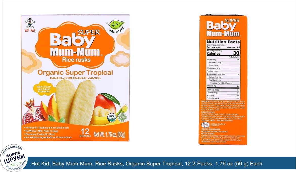 [DESCRIPT]Super. Banana- Pomegranate - Mango. Hot-Kid. With Protein and Added Prebiotics. USDA Organic. Gluten Free Certification Program - Beyond Celiac. Perfect for Teething First Solid Food. No Wheat, Milk, Nuts or Eggs. Dissolves Easily, No Mess. No Artificial Ingredients or Preservatives. Certified Organic by Ecocert SA. Baby Mum-Mum is the original and most popular rice teething biscuit in North America, parent trusted for over 25 years. They are made from premium Japonica rice and dissolve easily, making it a perfect gluten free, no-mess choice for your child. You may give Baby Mum-Mum Rice Rusks to your child as soon as they are ready for solid food. Baby Mum-Mums remain free of the top common allergens! Milk. Peanuts. Wheat. Tree Nuts. Soy. Shellfish. Fish. Sesame. Eggs. Baby Mum-Mum Super, a new series of teething rice rusks with benefits for your child! With Prebiotics.Dietary fibers that act as food for the good bacteria, in your child's body. With Protein.A viral nutrient that supports growth. With organic and delicious superfruits. We care about everything related to your child. That's why we select premium organic ingredients to bring your child a super treat.[/DESCRIPT]... (описание дополняется)