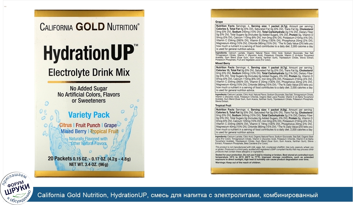. HydrationUP™. от. California Gold Nutrition. Смесь для приготовления электролитического напитка, ассорти из 5 вкусов. Цитрус, виноград, фруктовый пунш, ягодный микс и тропические фрукты. Низкокалорийные электро...