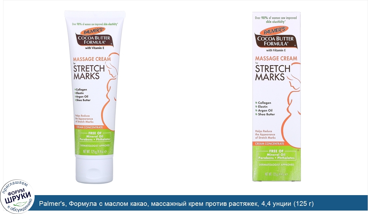 [DESCRIPT]Свыше 98% женщин заметили улучшение эластичности кожи*. С витамином E. Коллаген. Эластин. Аргановое масло. Масло ши. Снижает видимость растяжек. Крем-концентрат. Не содержит: минеральное масло, парабены, фталаты. Одобрен дерматологами. Содержит натуральный витамин E. Palmers выступает против экспериментов на животных. Семейный бизнес. Гипоаллергенный продукт. Пригодно для чувствительной кожи. Массажный крем Palmers повышает эластичность кожи и снижает проявление растяжек. Чистое масло какао и масло ши, натуральные масла, коллаген, эластин и лютеин заботятся об увлажненности кожи и ее наполнении питательными веществами на 48 часов, что позволяет коже лучше растягиваться. Широко рекомендуется для применения для предотвращения растяжек во время беременности или колебаний веса. Эта концентрированная формула идеальна для зон, склонных к растяжкам, например, живот, внешняя и внутренняя часть бедер и бюст. *На основании данных 8-недельного внутреннего клинического испытания на 102 женщинах в возрасте от 18 до 49 лет.[/DESCRIPT]... (описание дополняется)
