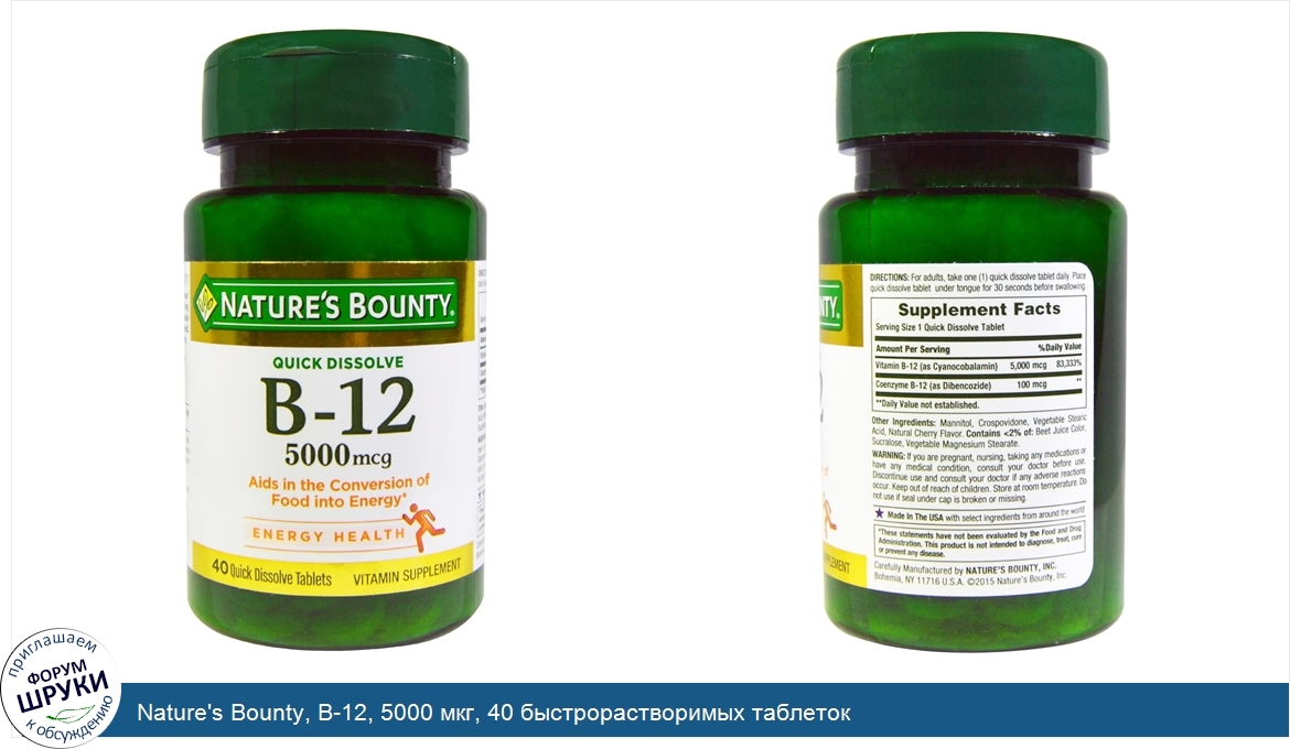 Nature's Bounty, B-12, 5000 мкг, 40 быстрорастворимых таблеток