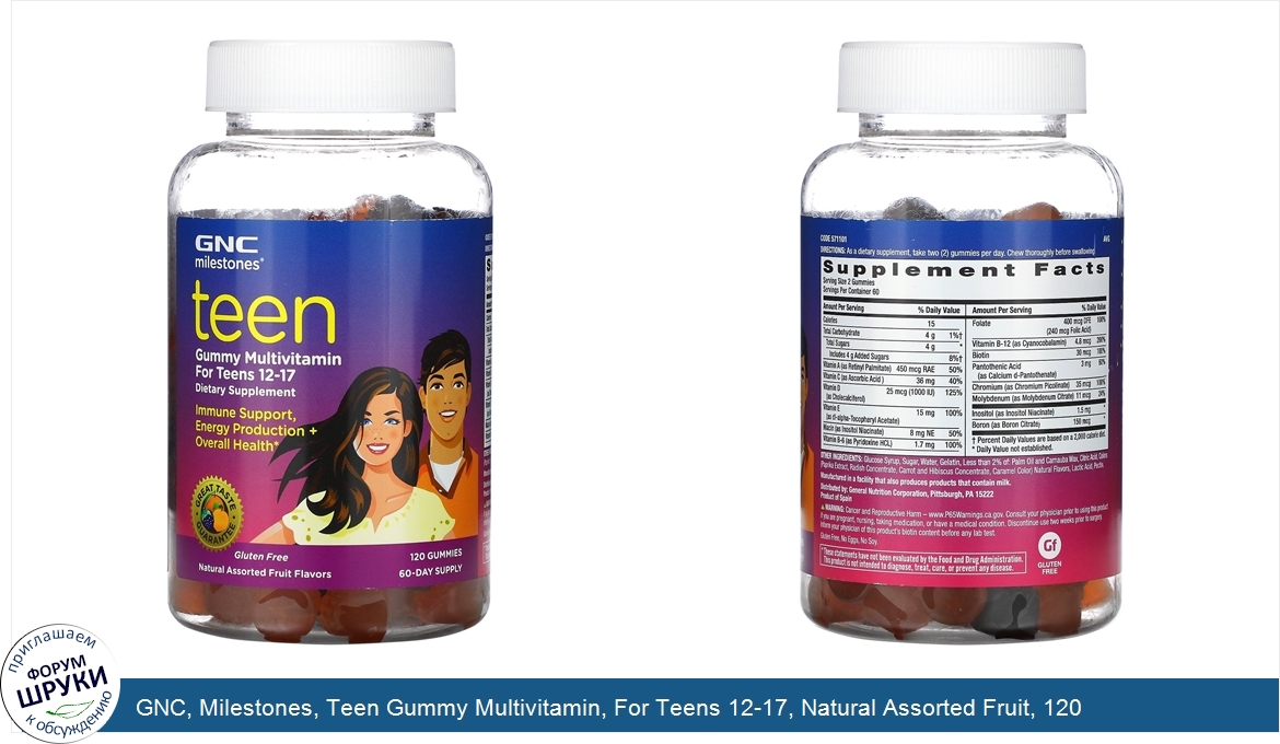 Друзья, если у вас есть отзыв/дополнение/комментарий/вопрос относительно GNC, Milestones, Teen Gummy Multivitamin, For Teens 12-17, Natural Assorted Fruit, 120 Gummies - напишите его ответом в эту тему (это будет полезно всему сообществу в целом и вам в отдельности).