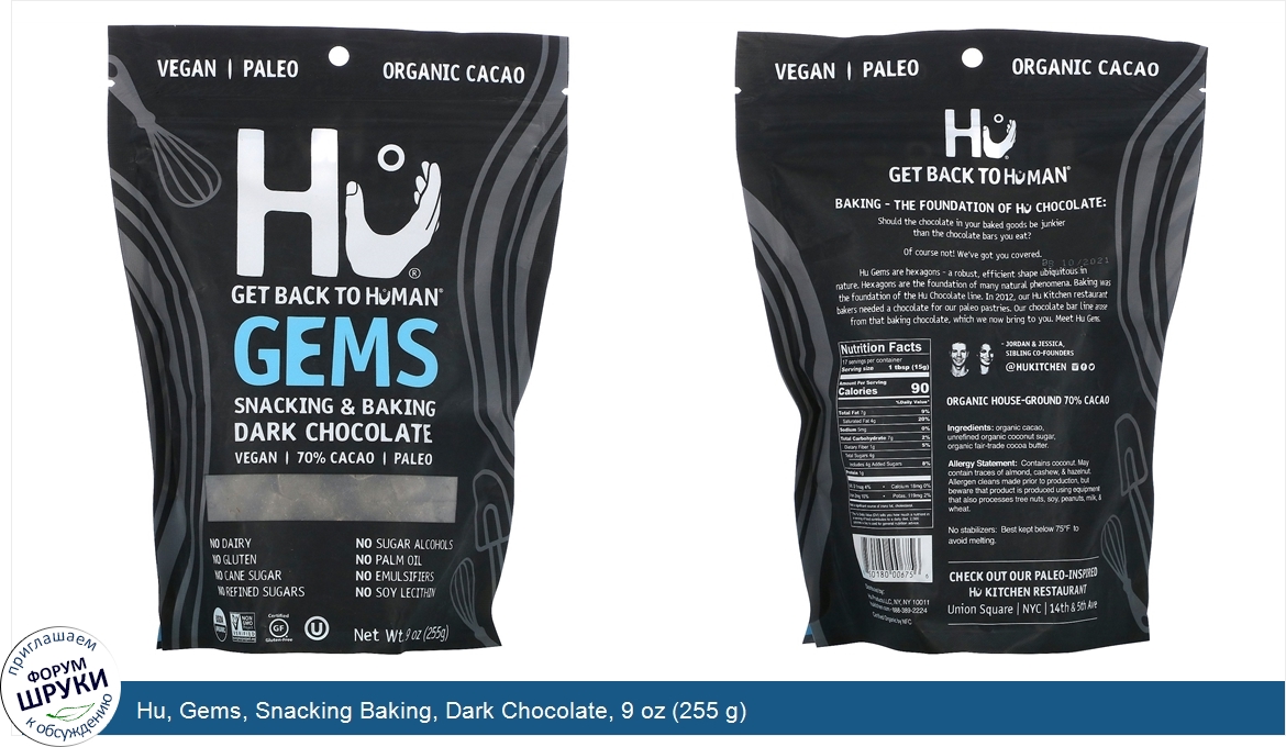 [DESCRIPT]Get Back to Human®. Vegan. Organic House Ground 70% Cacao. Paleo. No Dairy / Certified Gluten Free. No Refined / Cane Sugar. No Palm Oil. No Sugar Alcohols. No Emulsifiers. No Soy Lecithin. USDA Organic. Non GMO Project Verified. Kosher. Certified Organic by NFC. Baking - The foundation of HU Chocolate:. Should the cholate in your backed goods be junkier than the chocolate bars you eat? Of course not! We've got you covered. Hu Gems are hexagons - a robust, efficient shape ubiquitous in nature. Hexagons are the foundation of many natural phenomena. Baking was the foundation of the Hu chocolate line. In 2012, our Hu kitchen restaurant bakers needed a chocolate for our paleo pastries. Our chocolate bar line arose from that baking chocolate, which we now bring to you. Meet Hu Gems. - Jordan Jessica. Sibling Co-founders[/DESCRIPT]... (описание дополняется)