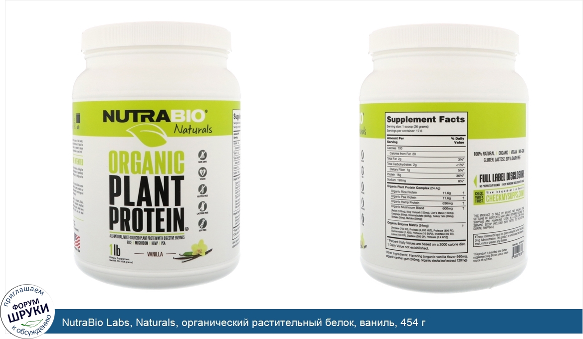[DESCRIPT]Naturals. Non GMO. Vegan. Gluten Free. Lactose Free. Soy Free. Kosher. All-Natural, Multi-Sourced Plant Protein with Digestive Enzymes. Rice - Mushroom - Hemp - Pea. Dietary Supplement. 100% Natural. Organic. Gluten, Lactose, Soy Dairy Free. Full Label Disclosure - No Proprietary Blends - Every Ingredient Disclosed with Dosage. Since 1996. Protein, Like Mother Nature Intended. NutraBio's Organic Plant Protein combines four raw plant protein sources, fusing the natural benefits of pea, rice, hemp and mushroom proteins. We handpick our ingredients from organic family farms and manufacture in our own cGMP facility to bring you the cleanest, highest-quality plant protein. This is simply the best-tasting organic plant protein there is. It has specialized enzyme blend to improve digestion and includes all essential amino acids. We gently produce our protein using low-temperature, low-shear technology, which prevents denaturing and preserves the integrity of the protein, just like Mother Nature intended.[/DESCRIPT]... (описание дополняется)