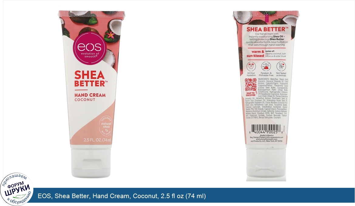Друзья, если у вас есть отзыв/дополнение/комментарий/вопрос относительно EOS, Shea Better, Hand Cream, Coconut, 2.5 fl oz (74 ml) - напишите его ответом в эту тему (это будет полезно всему сообществу в целом и вам в отдельности).