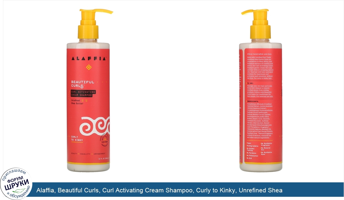 [DESCRIPT]Beauty - Equality - Empowerment. Traditional Authentic West African Fair Trade Ingredients. Vegan. Biodegradable. No Animal Testing. No Parabens. No Phthalates. No SLS. No Synthetic Fragrance. No Mineral Oil. No Synthetic Dyes. Made with love and respect. Alaffia is a social enterprise on a mission to create a more sustainable and equitable future. Our women-led cooperatives in West African produce heritage, nutrient-rich African ingredients rooted in tradition. Ethical, handcrafted, and clean. Made with Certified Fair Trade unrefined shea butter from our cooperatives in West Africa, and botanical extracts of comfrey and arnica, our Curl Activating Cream Shampoo gently cleans the scalp and hair without stripping natural oils. Your hair will have unrivaled moisture for maximum curl activation and retention, without the frizz. For curly to kinky hair.[/DESCRIPT]... (описание дополняется)