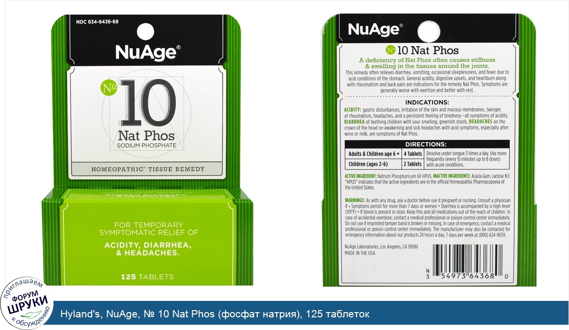 Друзья, если у вас есть отзыв/дополнение/комментарий/вопрос относительно Hyland's, NuAge, № 10 Nat Phos (фосфат натрия), 125 таблеток - напишите его ответом в эту тему (это будет полезно всему сообществу в целом и вам в отдельности).