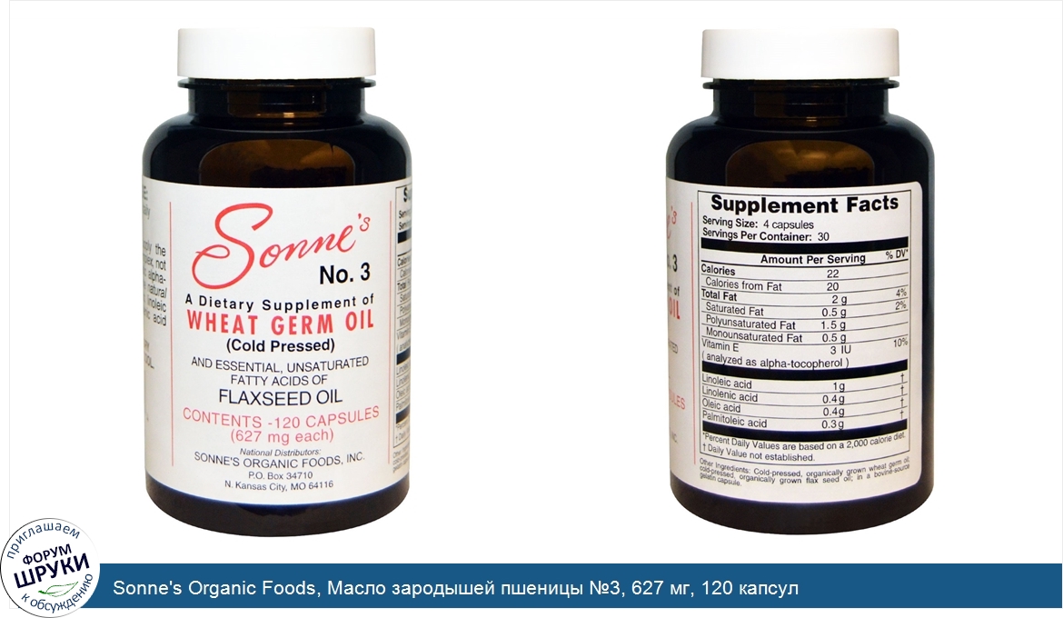 ru Sonne's Organic Foods, Масло зародышей пшеницы №3, 627 мг, 120 капсул