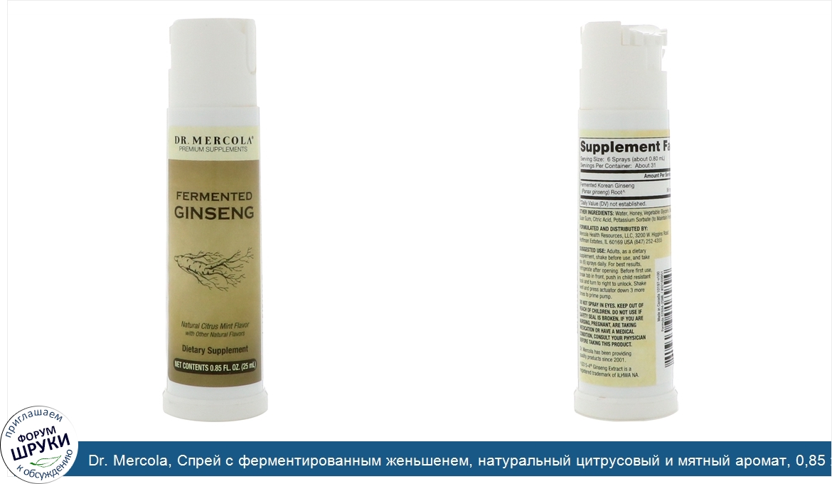 Dr. Mercola, Спрей с ферментированным женьшенем, натуральный цитрусовый и мятный аромат, 0,85 ж. унц. (25 мл)