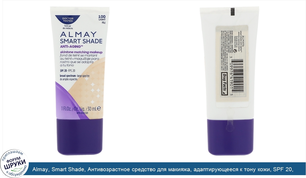 Almay, Smart Shade, Антивозрастное средство для макияжа, адаптирующееся к тону кожи, SPF 20, 100 светлый, 1 ж. унц.(30 мл)