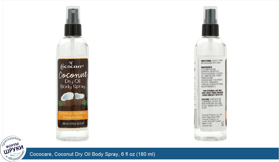 Друзья, если у вас есть отзыв/дополнение/комментарий/вопрос относительно Cococare, Coconut Dry Oil Body Spray, 6 fl oz (180 ml) - напишите его ответом в эту тему (это будет полезно всему сообществу в целом и вам в отдельности).
