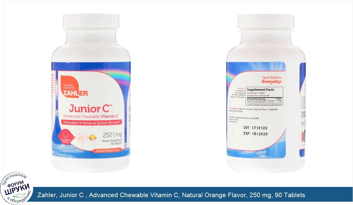 Друзья, если у вас есть отзыв/дополнение/комментарий/вопрос относительно Zahler, Junior C , Advanced Chewable Vitamin C, Natural Orange Flavor, 250 mg, 90 Tablets - напишите его ответом в эту тему (это будет полезно всему сообществу в целом и вам в отдельности).