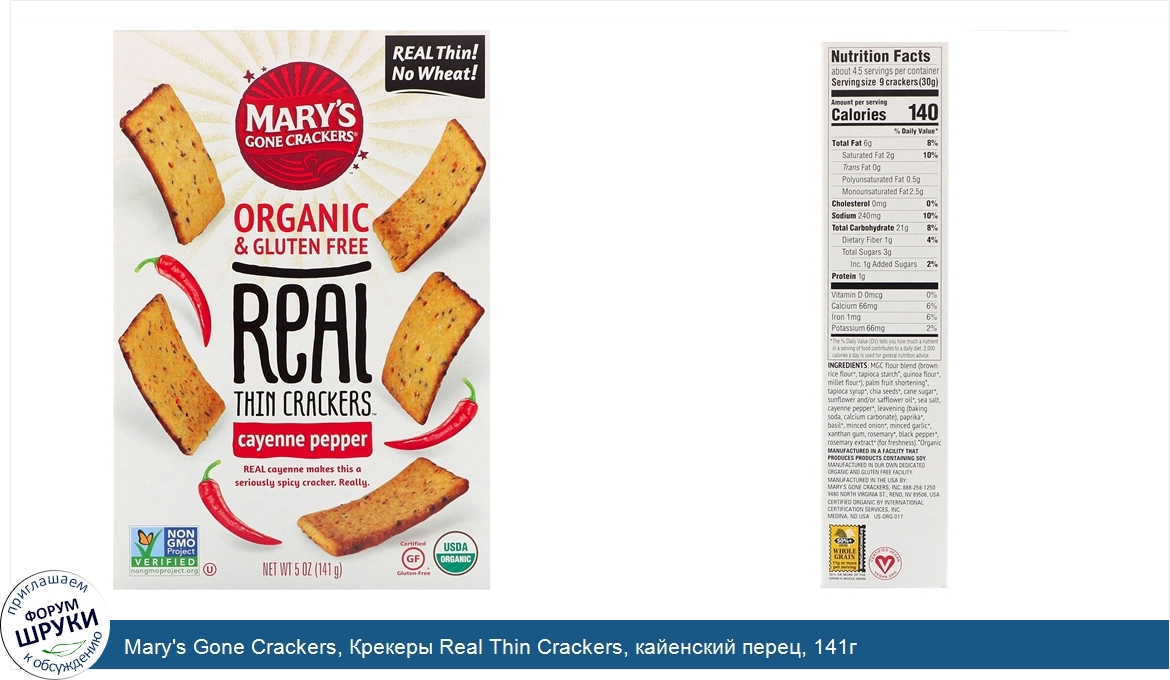 [DESCRIPT]Organic Gluten Free. Real Thin! No Wheat! . Real Cayenne Makes This a Seriously Spicy Cracker. Really. Non-GMO Project Verified. Kosher. Certified Gluten-Free. USDA Organic. Certified Organic by International Certification Services Inc. 50% Whole Grain - 11 g or More Per Serving - 50% or More of the Grains is Whole Grain. Certified Vegan. Real Crispy. Real Good. Real Familiar. Everything you want in a thin except the wheat. Mary's Real This Crackers are made from real, whole food, certified organic ingredients, skillfully baked to prove you don't need wheat to make toasty tasting crackers. About all, Mary's Real Thin Crackers satisfy the hunger for something authentic and delicious. From our very own gluten free bakery, they're made for everyone to enjoy. When it comes to snacks, nobody keeps it real like Mary's! Dear Savvy Snackers Label Lookers,. This real nice box of toasty, tasty This Crackers will check all your boxes! Real satisfying? ✓. Real delicious? ✓. Absolutely no GMO ingredients. Did we mention they're also Gluten Free Organic? If they weren't, Mary wouldn't put her name on them. (yes, she's real too! ✓). Now even wheat lovers can enjoy gluten free. The Difference is REAL![/DESCRIPT]... (описание дополняется)