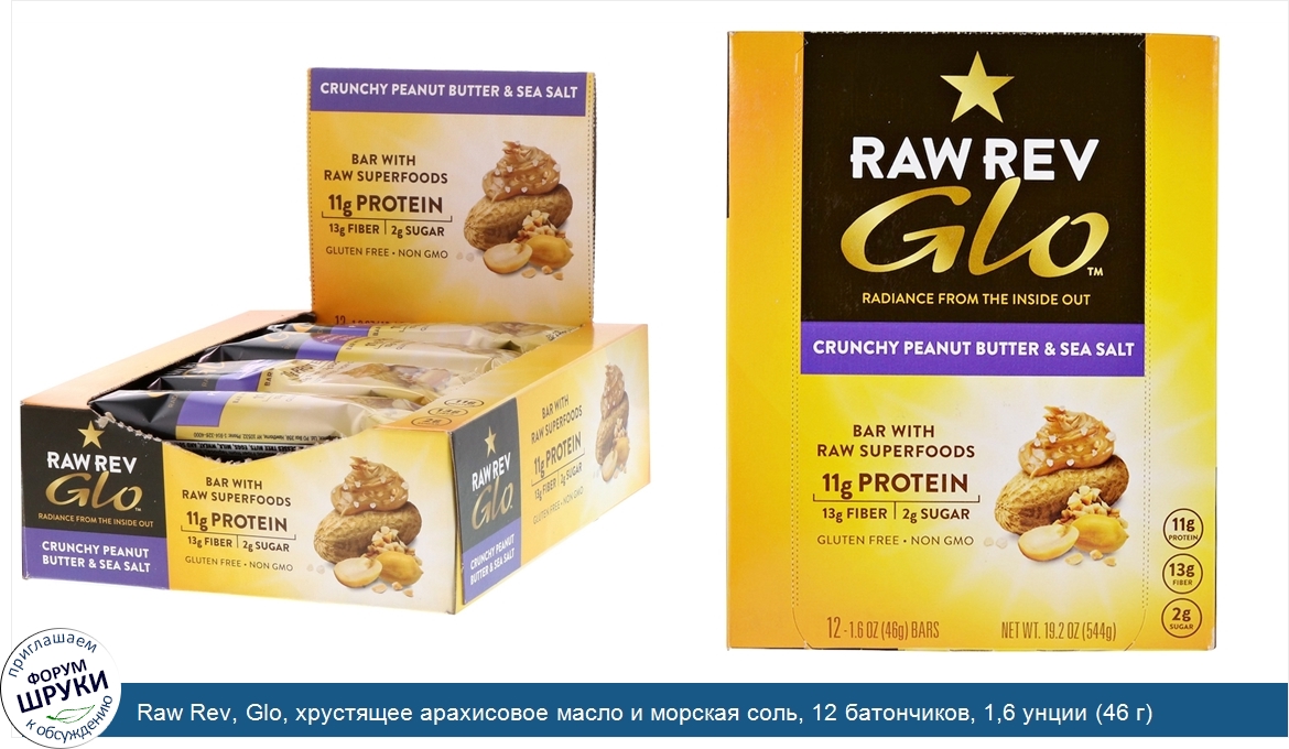 Raw Rev, Glo, хрустящее арахисовое масло и морская соль, 12 батончиков, 1,6 унции (46 г)