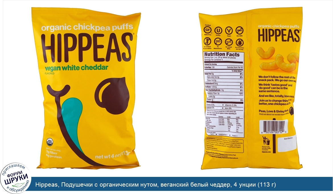 Друзья, если у вас есть отзыв/дополнение/комментарий/вопрос относительно Hippeas, Подушечки с органическим нутом, веганский белый чеддер, 4 унции (113 г) - напишите его ответом в эту тему (это будет полезно всему сообществу в целом и вам в отдельности).