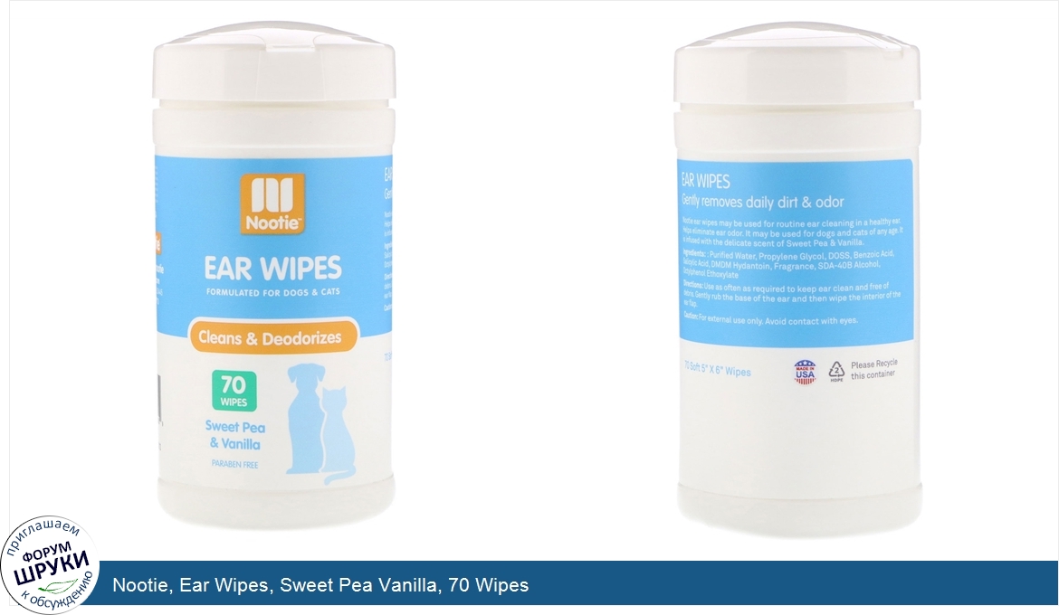 [DESCRIPT]Cleans Deodorizes. Paraben Free. 70 Soft 5" X 6" Wipes. Gently removes daily dirt odor. Nootie ear wipes may be used for routine ear cleaning in a healthy ear. Helps eliminate ear odor. It may be used for dogs and cats any age. It is infused with the delicate scent of Sweet Pea Vanilla.[/DESCRIPT]... (описание дополняется)