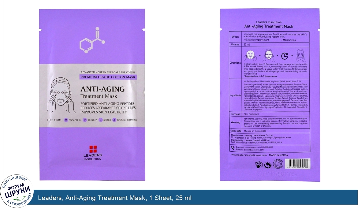 Друзья, если у вас есть отзыв/дополнение/комментарий/вопрос относительно Leaders, Anti-Aging Treatment Mask, 1 Sheet, 25 ml - напишите его ответом в эту тему (это будет полезно всему сообществу в целом и вам в отдельности).
