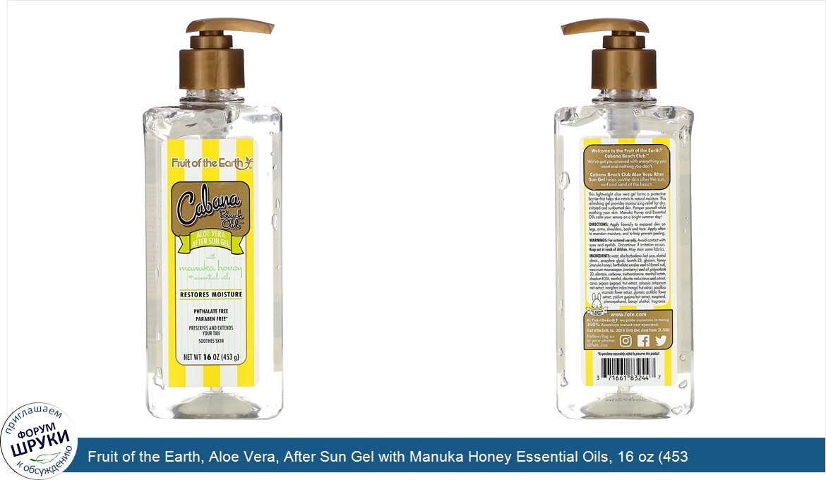 [DESCRIPT]Restores Moisture. Phthalate Free. Paraben Free*. Preserves and Extends Your Tan. Soothes Skin. No Animal Testing. Welcome to the Fruit of the Earth®. Cabana Beach Club. ™. We've got you covered with everything you want and nothing you don't. Cabana Beach Club Aloe Vera After Sun Gel helps soothe skin after the sun, surf and sand at the beach. This lightweight aloe vera gel forms a protective barrier that helps skin retain its natural moisture. This refreshing gel provides moisturizing relief for dry, irritated and sunburned skin. Pamper yourself while soothing skin. Manuka Honey and Essential Oils calm your senses on a bright summer day! *No parabens separately added to preserve this product.[/DESCRIPT]... (описание дополняется)