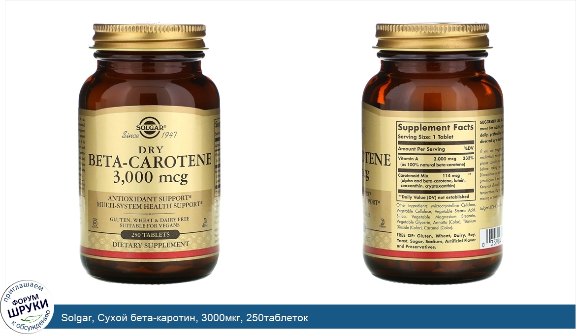 Друзья, если у вас есть отзыв/дополнение/комментарий/вопрос относительно Solgar, Сухой бета-каротин, 3000мкг, 250таблеток - напишите его ответом в эту тему (это будет полезно всему сообществу в целом и вам в отдельности).