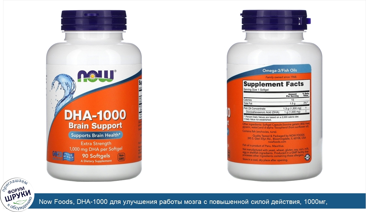 [DESCRIPT]Supports Brain Health. 1,000 mg DHA per Softgel. GOED Omega-3 - Proud Member. A Dietary Supplement. Non-GMO. Omega-3 / Fish Oils. Family Owned Since 1968. GMP Quality Assured. DHA helps support brain health and plays a role in cognitive function. NOW® DHA-1000 Brain Support has four times the DHA (1,000 mg per softgel) than our regular strength product (250 mg per softgel). This fish oil concentrate is manufactured under strict quality control standards. It is tested to be free of potentially harmful levels of contaminants such as PCBs, dioxins, mercury and other heavy metals.[/DESCRIPT]... (описание дополняется)