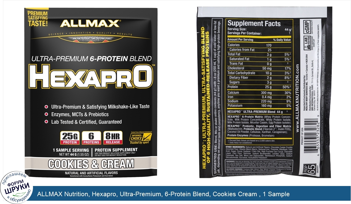ru ALLMAX Nutrition, Hexapro, Ultra-Premium, 6-Protein Blend, Cookies Cream , 1 Sample Serving, 1.55 oz (44 g)