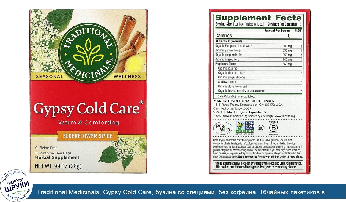 Traditional Medicinals, Gypsy Cold Care, бузина со специями, без кофеина, 16чайных пакетиков в упаковке, 28г (0,99унции)