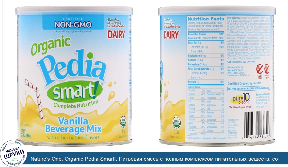 [DESCRIPT]Certified Non-GMO†. Gluten Free. No Corn Syrup. For Lactose Sensitivity. Dairy. Powder Add Water. With Other Natural Flavors. USDA Organic. Kosher Dairy. Certified Organic by OneCert. Pure 10 Pledge - We Make Organic Better. Organic Vanilla - Delicious Taste Kids Love! 240 Calories. 7 g Protein. 9 g Fat. 29 Vitamins Minerals. No Artificial Flavors. Use as part of a Healthy Diet. PediaSmart® is the Smart Organic Choice for children behind the growth curve, breakfast skippers and food sensitive kids. Even picky eaters love its great taste! When Used Under Direction of a Doctor:. PediaSmart® is nutritionally comparable to PediaSure® and is recommended for children who are in need of added calories. PediaSmart® may be used as a complete source of nutrition under the direction of a healthcare professional. For immune compromised children and tube feedings, use under the guidance of a doctor. Powdered formulas are not sterile. †No genetically engineered ingredients.[/DESCRIPT]... (описание дополняется)