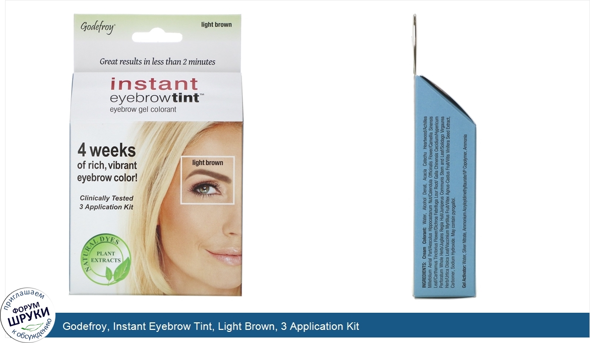 [DESCRIPT]Great Results In Less Than 2 Minutes. 4 Weeks of Rich, Vibrant Eyebrow Color! Clinically Tested. Natural Dyes - Plant Extracts. Contents Contain:. 3 -.03 fl oz. / 1 ml Cream Colorant. 3 -.03 fl oz. / 1 ml Gel Activator. 1 Reusable Applicator Stick, 3 Work station cards, instruction manual. Godefroy® Instant Eyebrow Tint is great alternative for individuals with sensitivities to traditional hair color. A non-toxic formula that contains no hydrogen peroxide or harsh dyes (PPD). Formulated with plant extracts, this fast acting, gentle formula delivers rich, long-lasting color for up to 4 weeks. Covers the most resistant gray hair. Q A. Q. Why tint your eyebrows with Godefroy® Instant Eyebrow Tint? A. A great alternative to daily eyebrow pencil and powder application, tinting your eyebrows help define each eyebrow hair and gives the appearance of longer, thicker eyebrows. Q. How long will it last? A. With proper application, it will last up to 4 weeks or longer. Waterproof and non-fading, you can enjoy all outdoor activities without applying daily eyebrow color. Q. How long does it take to apply and process? A. The simple two step process takes two minutes to apply and process. Q. Is it safe to use? A. Yes! Godefroy® Instant Eyebrow Tint is clinically tested safe for use.[/DESCRIPT]... (описание дополняется)