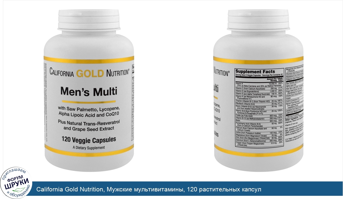 Друзья, если у вас есть отзыв/дополнение/комментарий/вопрос относительно California Gold Nutrition, Мужские мультивитамины, 120 растительных капсул - напишите его ответом в эту тему (это будет полезно всему сообществу в целом и вам в отдельности).