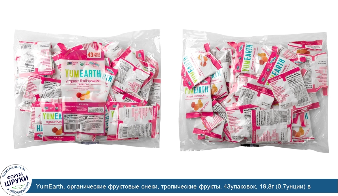 ru YumEarth, органические фруктовые снеки, тропические фрукты, 43упаковок, 19,8г (0,7унции) в каждой