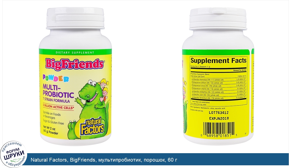 Друзья, если у вас есть отзыв/дополнение/комментарий/вопрос относительно Natural Factors, BigFriends, мультипробиотик, порошок, 60 г - напишите его ответом в эту тему (это будет полезно всему сообществу в целом и вам в отдельности).