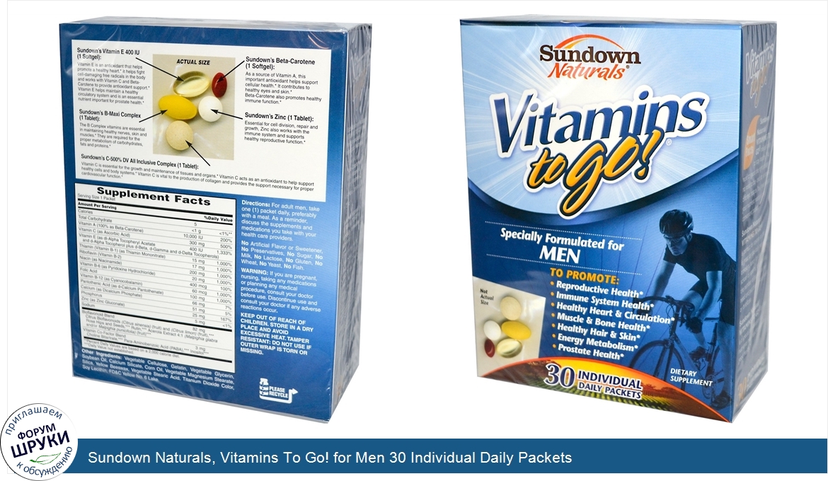 [DESCRIPT]Specially Formulated for Men. Dietary Supplement. Individual Daily Packets. To Promote: . Reproductive Health. Immune System Health. Healthy Heart Circulation. Muscle Bone Health. Healthy Hair Skin. Energy Metabolism. Prostate Health. Smart Facts. Sundown Naturals' Vitamins To Go makes it easy to stay healthy. No need to guess the right dosage and no need to buy and store several different bottles. You have most of your nutrient needs in one convenient packet. Sundown Naturals' Vitamins To Go is perfect for anyone on the go. It is great for the daily morning rush, travelers, handy for the office, school or sports. Just take along the number of packets you will need and put them in your pocket or briefcase. Sundown Naturals' Vitamins To Go for Men is a special combination of nutrients men need to support good health. Sundown's Vitamin E 400 IU (1 Softgel): Vitamin E is an antioxidant that helps promote a healthy heart. It helps fight cell-damaging free radicals in the body and works with Vitamin C and Beta-Carotene to provide antioxidant support. Vitamin E helps maintain a healthy circulatory system and is an essential nutrient important for prostate health. Sundown's B-Maxi Complex (1 Tablet): The B Complex vitamins are essential in maintaining healthy nerves, skin and muscles. They are required for the proper metabolism of carbohydrates, fats and proteins. Sundown's Beta-Carotene (1 Softgel): As a source of Vitamin A, this important antioxidant helps support cellular health. It contributes to healthy eyes and skin. Beta-Carotene also promotes healthy immune function. Sundown's Zinc (1 Tablet): Essential for cell division, repair and growth, Zinc also works with the immune system and supports healthy reproductive function. Sundown's C-500% DV All Inclusive Complex (1 Tablet): Vitamin C is essential for the growth and maintenance of tissues and organs. Vitamin C acts as an antioxidant to help support healthy cells and body systems. Vitamin C is vital to the production of collagen and provides the support necessary for proper cardiovascular function. Each Sundown Naturals' Vitamins To Go Packet For Men includes these important Nutrients: . The Antioxidants Beta-Carotene, 400 IU Vitamin E and 300 mg Calcium. B-Maxi Complex. Zinc.[/DESCRIPT]... (описание дополняется)