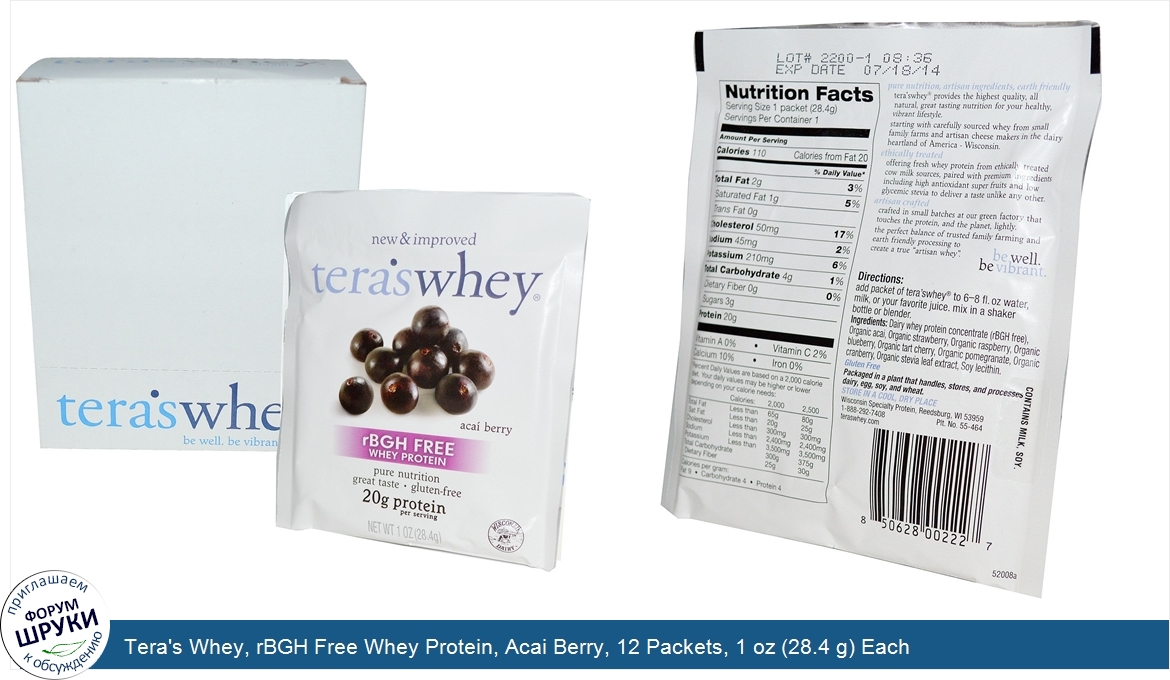 Друзья, если у вас есть отзыв/дополнение/комментарий/вопрос относительно Tera's Whey, rBGH Free Whey Protein, Acai Berry, 12 Packets, 1 oz (28.4 g) Each - напишите его ответом в эту тему (это будет полезно всему сообществу в целом и вам в отдельности).