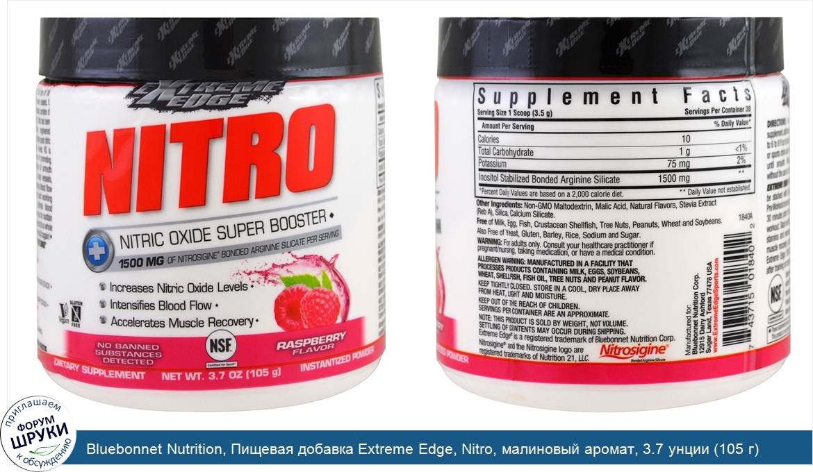 Bluebonnet Nutrition, Пищевая добавка Extreme Edge, Nitro, малиновый аромат, 3.7 унции (105 г)