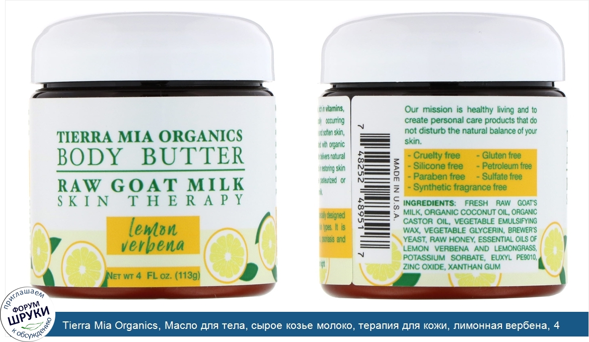 [DESCRIPT]Cruelty Free. Silicone Free. Paraben Free. Synthetic Fragrance Free. Gluten Free. Petroleum Free. Sulfate Free. We start with fresh raw goat's milk, rich in vitamins, minerals, proteins naturally occurring alpha-hydroxy acids, which exfoliate and soften skin, aiding in cellular renewal. Formulated with organic castor and coconut oil, this body butter delivers natural skin protection. Raw goats' milk aids in restoring skin to its proper pH. We never use pasteurized or powdered milk. We never dilute our milk with water. Tierra Mia Organics Body Butter is specifically designed for extremely dry and sensitive skin types. It is customer proven to soothe eczema, psoriasis and chapped skin. Our mission is healthy living and to create personal care products that do not disturb the natural balance of your skin.[/DESCRIPT]... (описание дополняется)