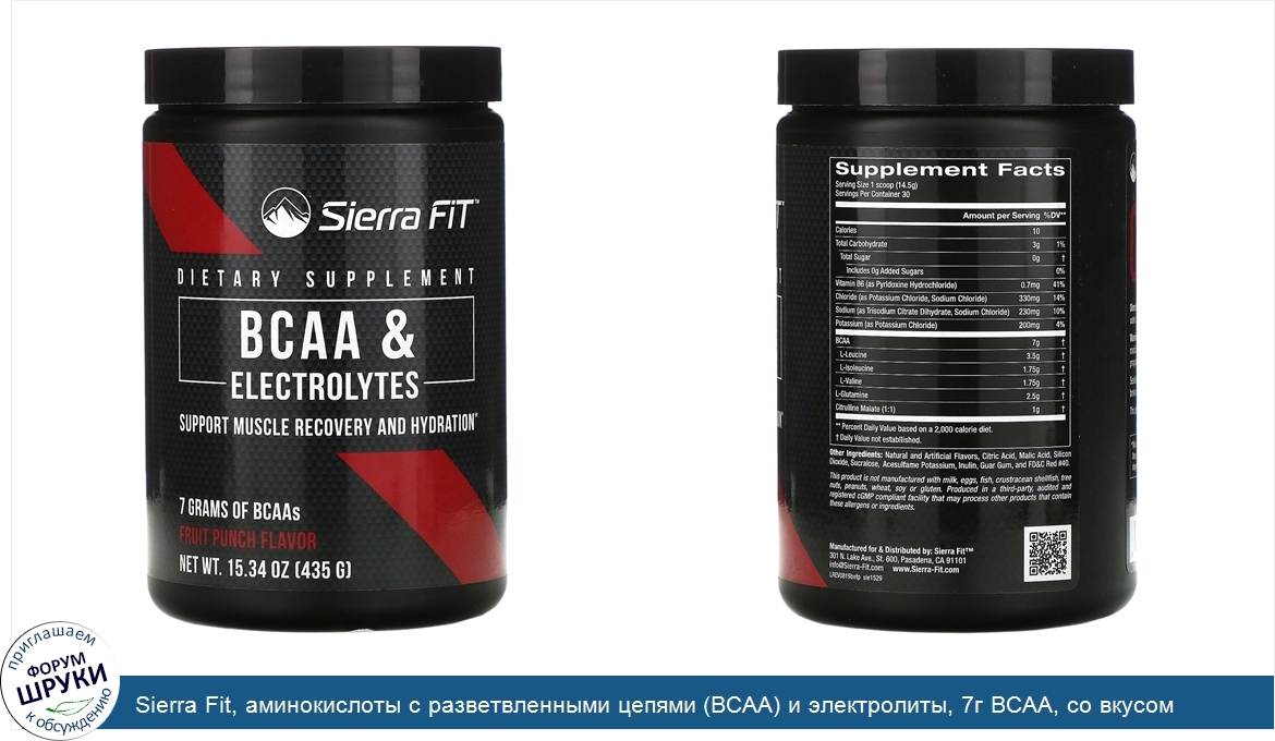 Sierra Fit, аминокислоты с разветвленными цепями (BCAA) и электролиты, 7г BCAA, со вкусом фруктового пунша, 435г (15,34унции)