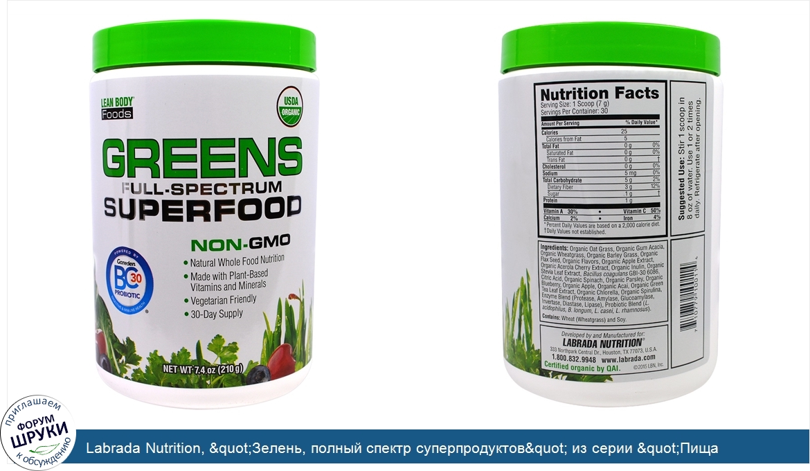 Друзья, если у вас есть отзыв/дополнение/комментарий/вопрос относительно Labrada Nutrition, "Зелень, полный спектр суперпродуктов" из серии "Пища для стройного тела", зеленый комплекс самых разных суперпродуктов, 7,4 унции (210 г) - напишите его ответом в эту тему (это будет полезно всему сообществу в целом и вам в отдельности).