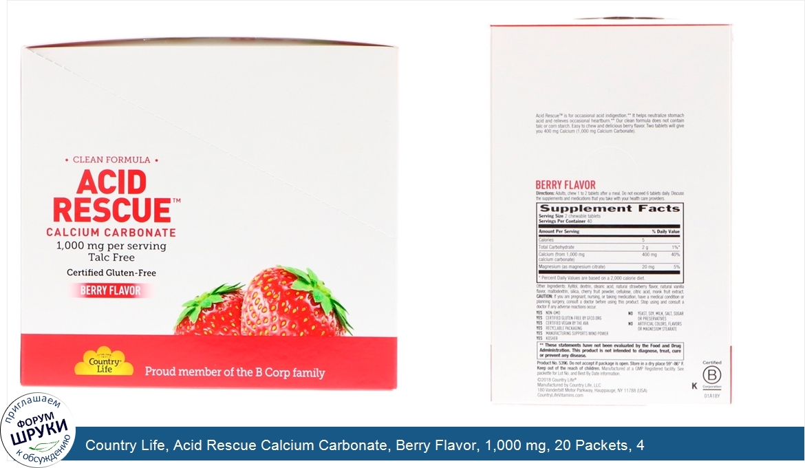 Друзья, если у вас есть отзыв/дополнение/комментарий/вопрос относительно Country Life, Acid Rescue Calcium Carbonate, Berry Flavor, 1,000 mg, 20 Packets, 4 Chewable Tablets Each - напишите его ответом в эту тему (это будет полезно всему сообществу в целом и вам в отдельности).