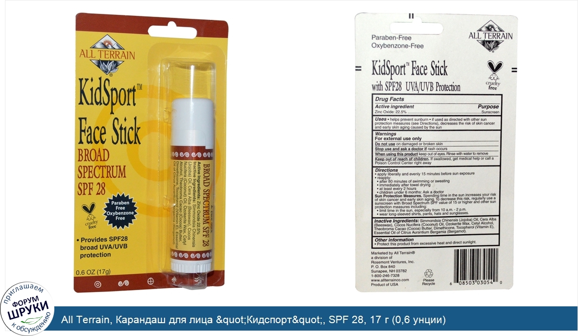 Друзья, если у вас есть отзыв/дополнение/комментарий/вопрос относительно All Terrain, Карандаш для лица "Кидспорт", SPF 28, 17 г (0,6 унции) - напишите его ответом в эту тему (это будет полезно всему сообществу в целом и вам в отдельности).
