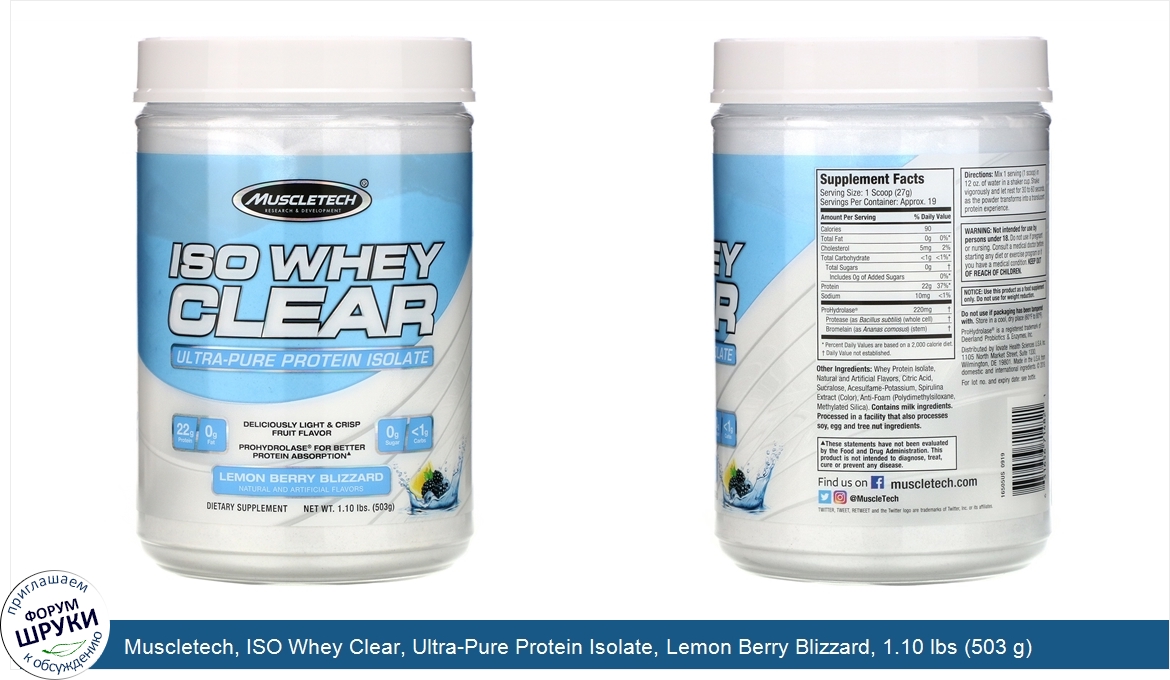 Друзья, если у вас есть отзыв/дополнение/комментарий/вопрос относительно Muscletech, ISO Whey Clear, Ultra-Pure Protein Isolate, Lemon Berry Blizzard, 1.10 lbs (503 g) - напишите его ответом в эту тему (это будет полезно всему сообществу в целом и вам в отдельности).