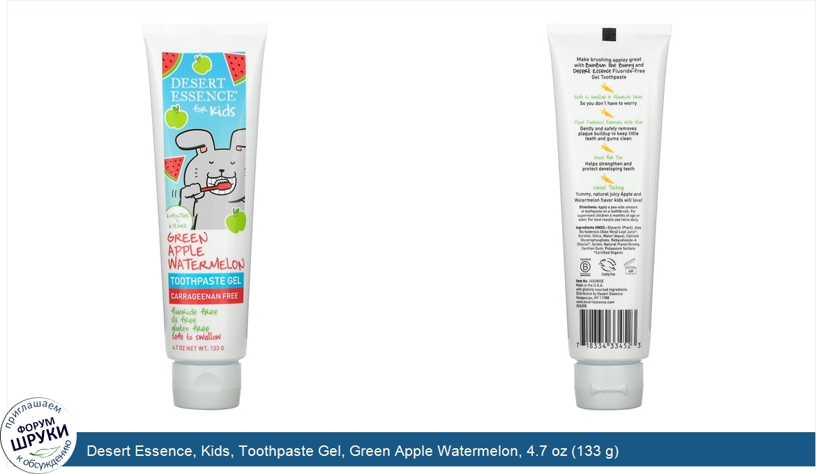 [DESCRIPT]6 Months to 6 Years. Carrageen Free. Fluoride Free. SLS Free. Gluten Free. Safe to Swallow. Certified B Corporation. Leaping Bunny Certified. Cruelty Free. Make brushing appley great with BunBun the Bunny and Desert Essence fluoride free gel toothpaste. Safe to Swallow + Fluoride Free. So you don't have to worry. Plant Powered Formula with Aloe. Gently and safely removes plaque buildup to keep little teeth and gums clean. Good for You. Helps strengthen and protect developing teeth. Great Tasting. Yummy, natural juice Apple and Watermelon flavor kids will love![/DESCRIPT]... (описание дополняется)