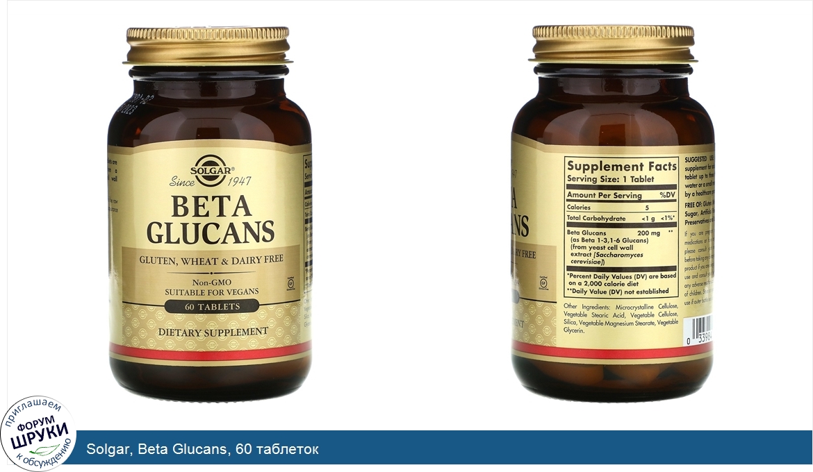 С 1947 года. Не содержит глютена, пшеницы и молочных продуктов. Не содержит ГМО. Подходит для веганов. Сертифицированный безглютеновый продукт. Пищевая добавка. Таблетки Solgar Beta Glucans получены естественным ...
