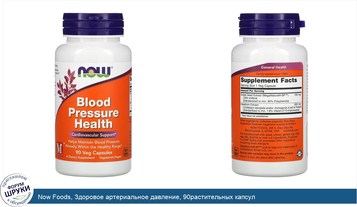 [DESCRIPT]Cardiovascular Support. Helps Maintain Blood Pressure Already Within The Healthy Range. MegaNatural-BP. A Dietary Supplement. Vegetarian/Vegan. Non-GMO. General Health. Family Owned Since 1968. GMP Quality Assured. NOW® Blood Pressure Health combines two botanicals widely known to support healthy cardiovascular function. MegaNatural®-BP™ is a patented and clinically tested Grape Seed Extract standardized for Polyphenols. MegaNatural®-BP™ has flavonoids that can support healthy arterial function and may help maintain blood pressure already within the healthy range. In addition, NOW has included a standardized Hawthorn Extract for free radical protection and cardiovascular support.[/DESCRIPT]... (описание дополняется)