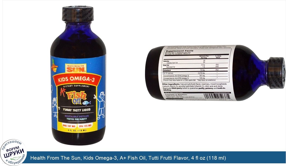 Друзья, если у вас есть отзыв/дополнение/комментарий/вопрос относительно Health From The Sun, Kids Omega-3, A+ Fish Oil, Tutti Frutti Flavor, 4 fl oz (118 ml) - напишите его ответом в эту тему (это будет полезно всему сообществу в целом и вам в отдельности).