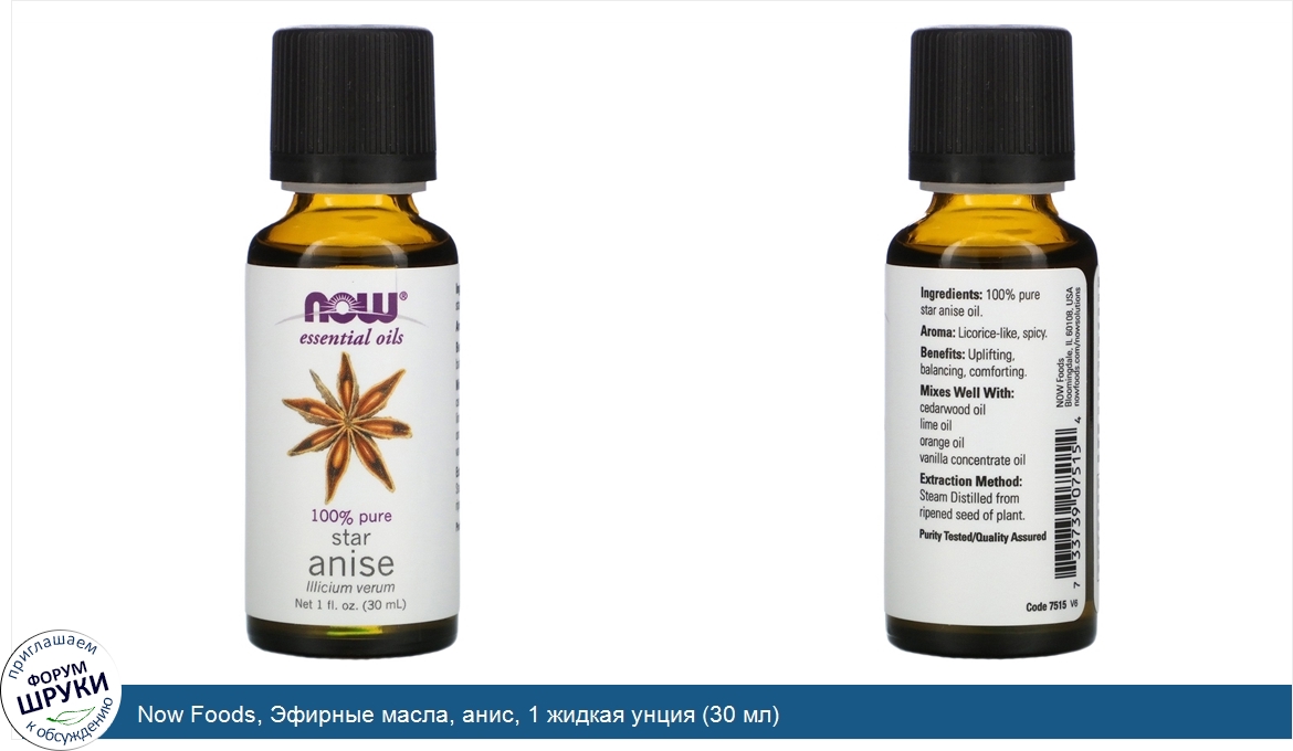 Друзья, если у вас есть отзыв/дополнение/комментарий/вопрос относительно Now Foods, Эфирные масла, анис, 1 жидкая унция (30 мл) - напишите его ответом в эту тему (это будет полезно всему сообществу в целом и вам в отдельности).