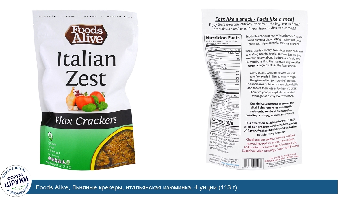 [DESCRIPT]Non-GMO. Vegan. Gluten Free. Non-Synthetic. Certified Vegan. Kosher. Green America Approved Business. USDA Organic. 5g Protein. 7g Fiber. 5.5g Omega-3. Each per serving. Eats Like a Snack - Fuels like a Meal. Enjoy these awesome crackers right from the bag, use as bread, crumble on salad, or with your favorite dips and spreads! Inside this package, our unique blend of Italian herbs create a pizza tasting cracker that goes great with dips, spreads, salads and soups. Foods Alive is a family owned company dedicated to crafting healthy foods, because just like you, we are deeply about the food our family eats. So, you'll only find the highest quality certified organic ingredients in the foods we make. Our Crackers come to life when we soak raw flax seeds in filtered water to begin the germination (or sprouting) process. This increases nutritional value, bio-availability and makes them easier to chew and digest. Then, we gently dehydrate our crackers overnight at a very low temperature. Our delicate process preserves the vital living enzymes and essential nutrients, while at the same time, creating a crispy, crunch, savory snack. This attention to detail, allows us to craft all of our products with the highest quality of flavor, freshness and essential nutrition.[/DESCRIPT]... (описание дополняется)